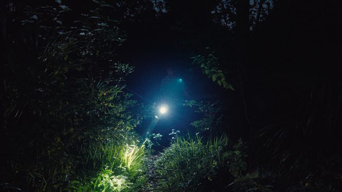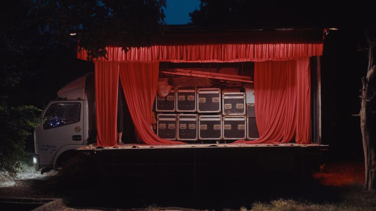 A young man cannot sleep. He ventures into the forest guided by the trace of a sound. A truck moves through the darkness of the night; it stops, unfolding into a stage in the woods, its red curtains billowing in the wind. The young man follows the sound across the river, across the woods, past the shadows of the trees. His torchlight lands upon the stage where an older woman starts her performance. Fireworks explode above the stage like drumbeats. Morning slowly dawns upon the silent woods of Nanxian, Southern China.